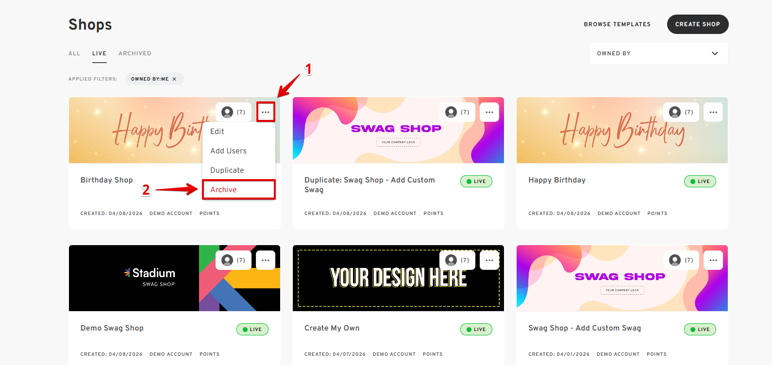- Locate the shop you wish to archive.