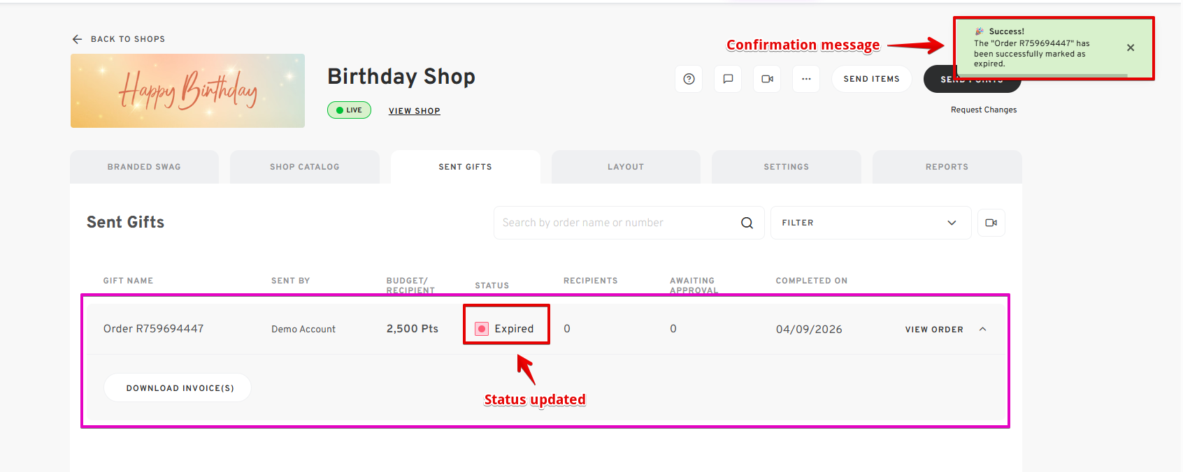 - A confirmation message will show, and the status of the order will be changed to "Expired."