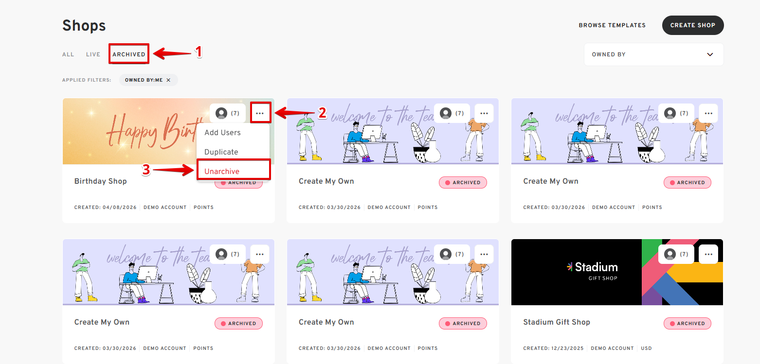 Follow the guide below on how to archive and unarchive a shop: