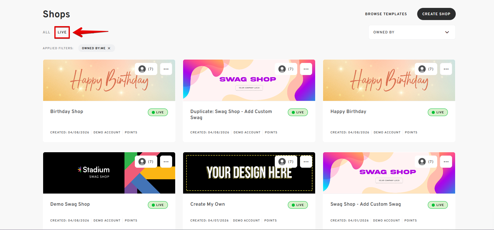 - On the " Shops" page, navigate to LIVE Shops.