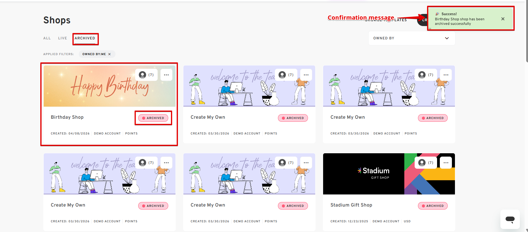 - Once successfully archived, your shop will be listed under the "ARCHIVED" section on your "Shops" page.