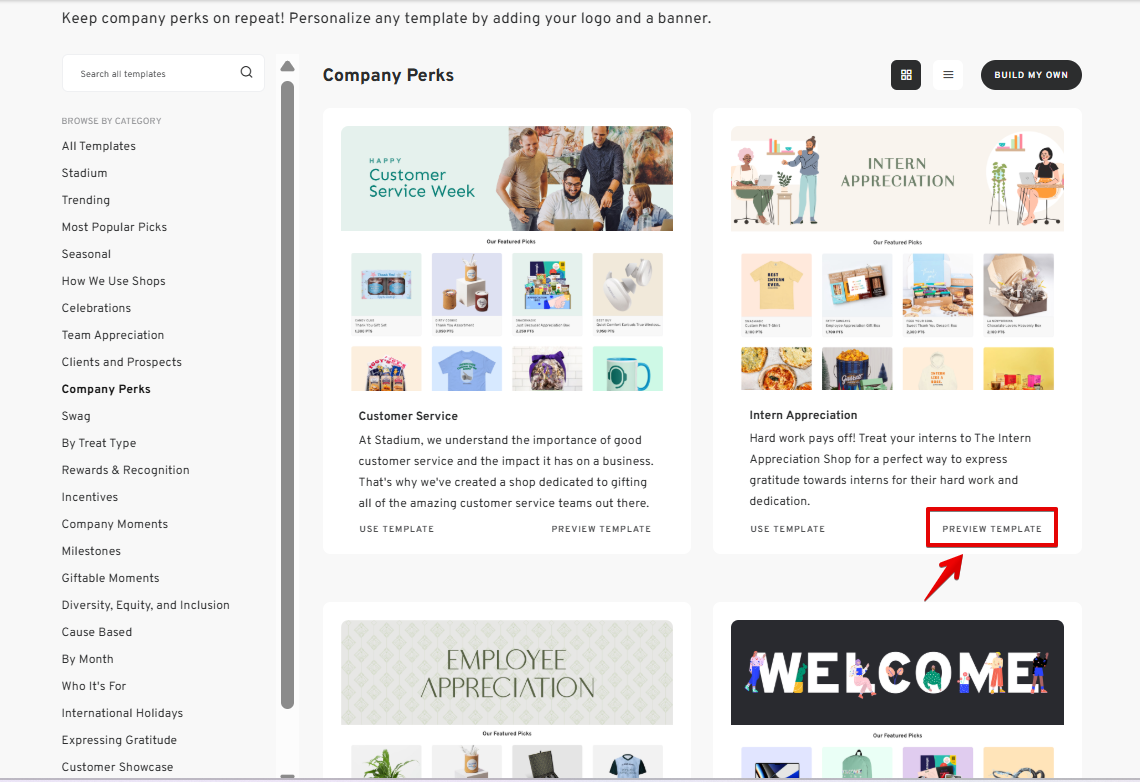 Pre-curated Shop Templates are perfect for events such as birthdays, anniversaries, holidays, employee recognition, and many more! This is an excellent way to create a shop without worrying about the design of your shop banners. Each template also comes with a curated category designed for a specific occasion.