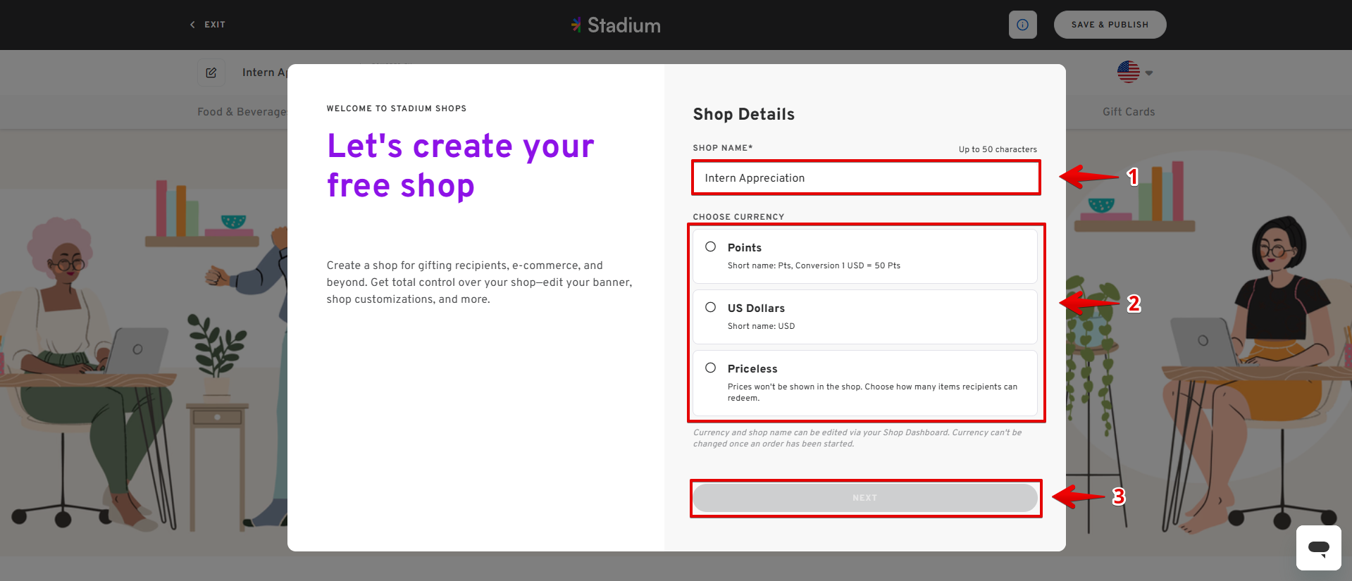 - Enter the shop name, then choose a currency. Then click the NEXT button to proceed.