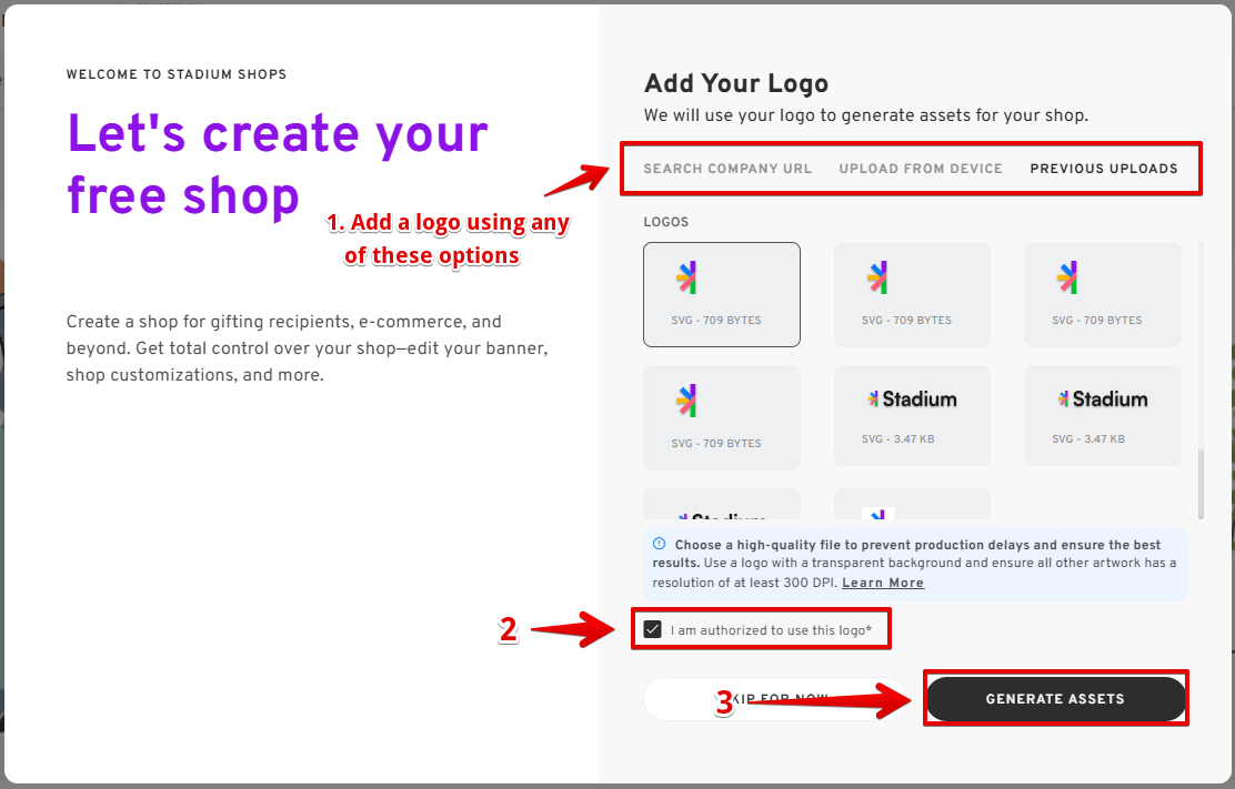 - Once done, click on "I am authorized to use this logo" and then click the "GENERATE ASSETS" button to proceed.