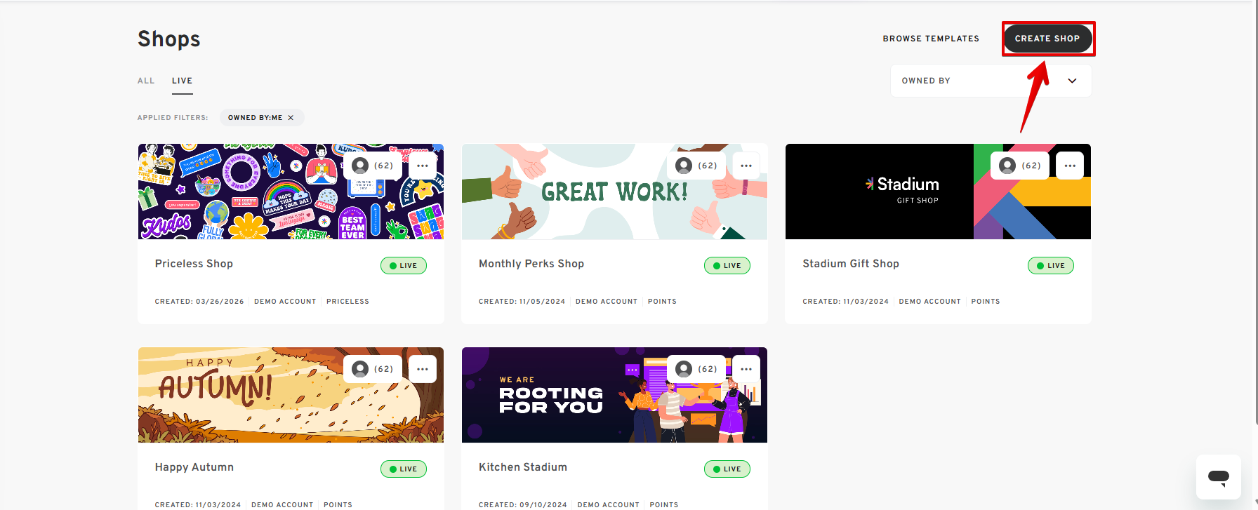 - From the Shops page, click on the CREATE SHOP button found in the top right corner.