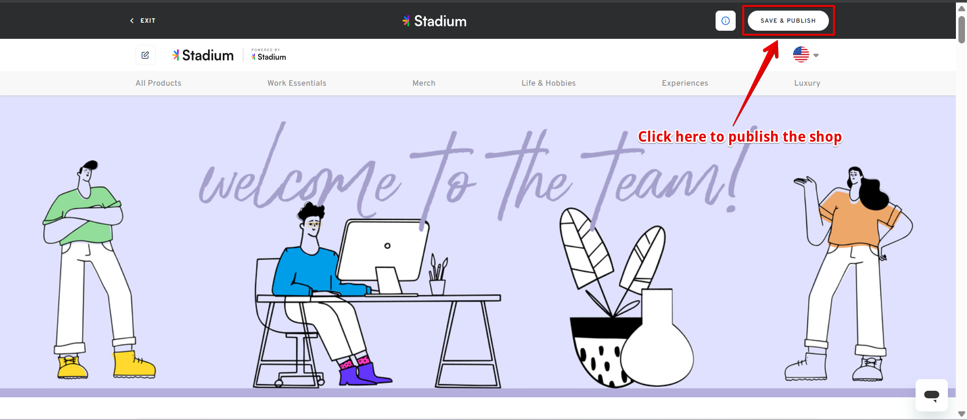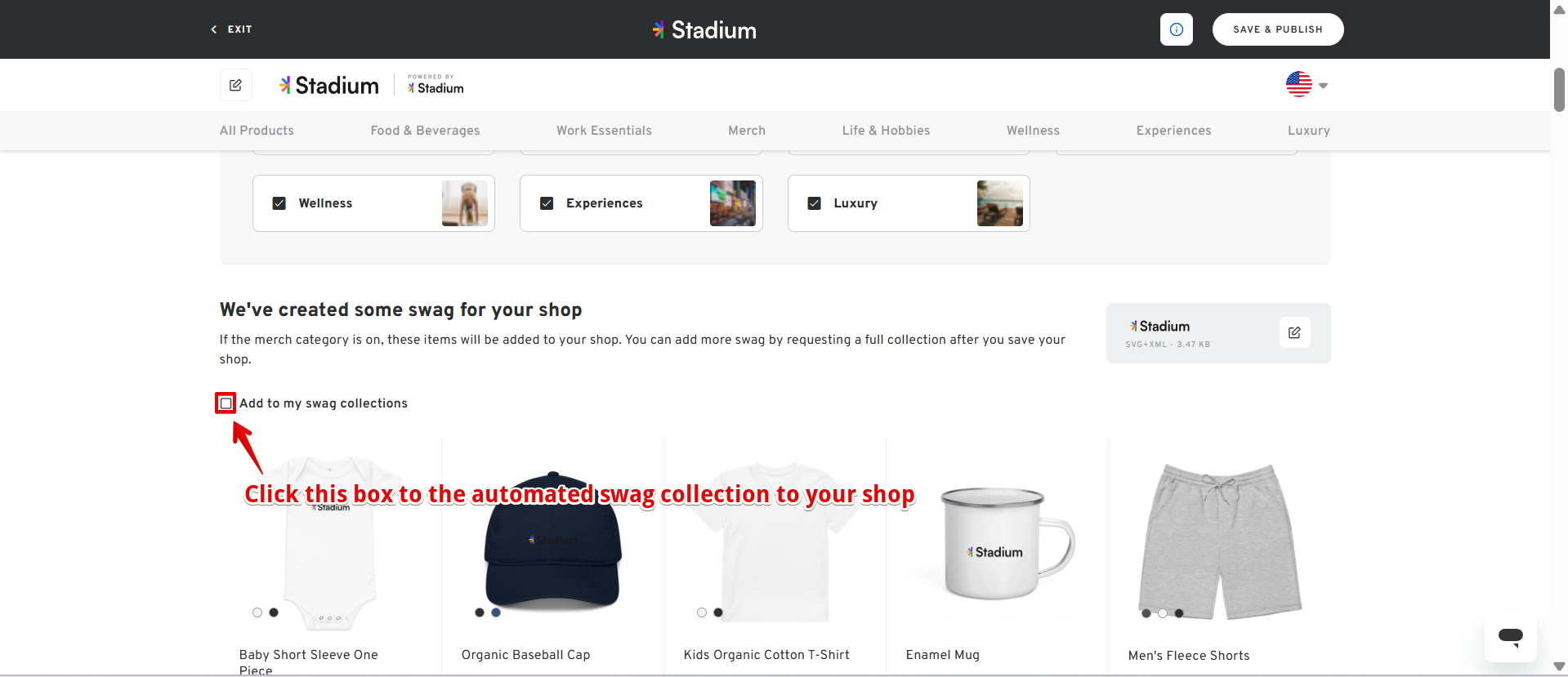 - Once done, review the Shop's logo, banner, categories, and automated swag items in your shop. If all looks good, click on the " SAVE & PUBLISH" button.