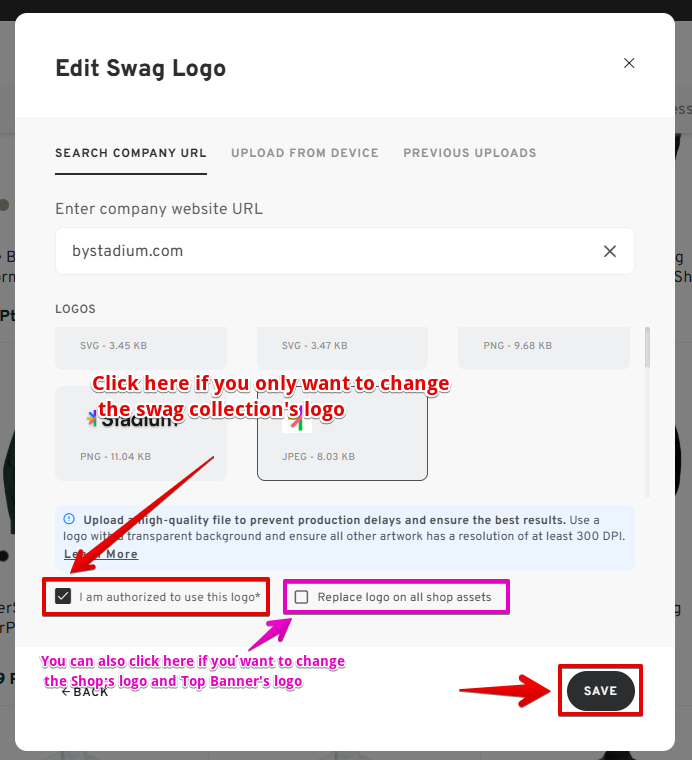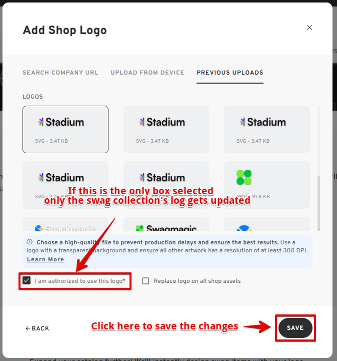- If you wish to apply the logo to your Swag collections only, just click on "I am authorized to use this logo*" and then click SAVE.