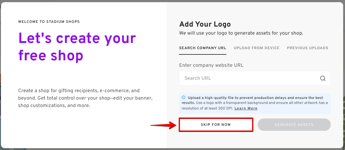 - If you don't have a logo to upload, you can click on "SKIP FOR NOW."