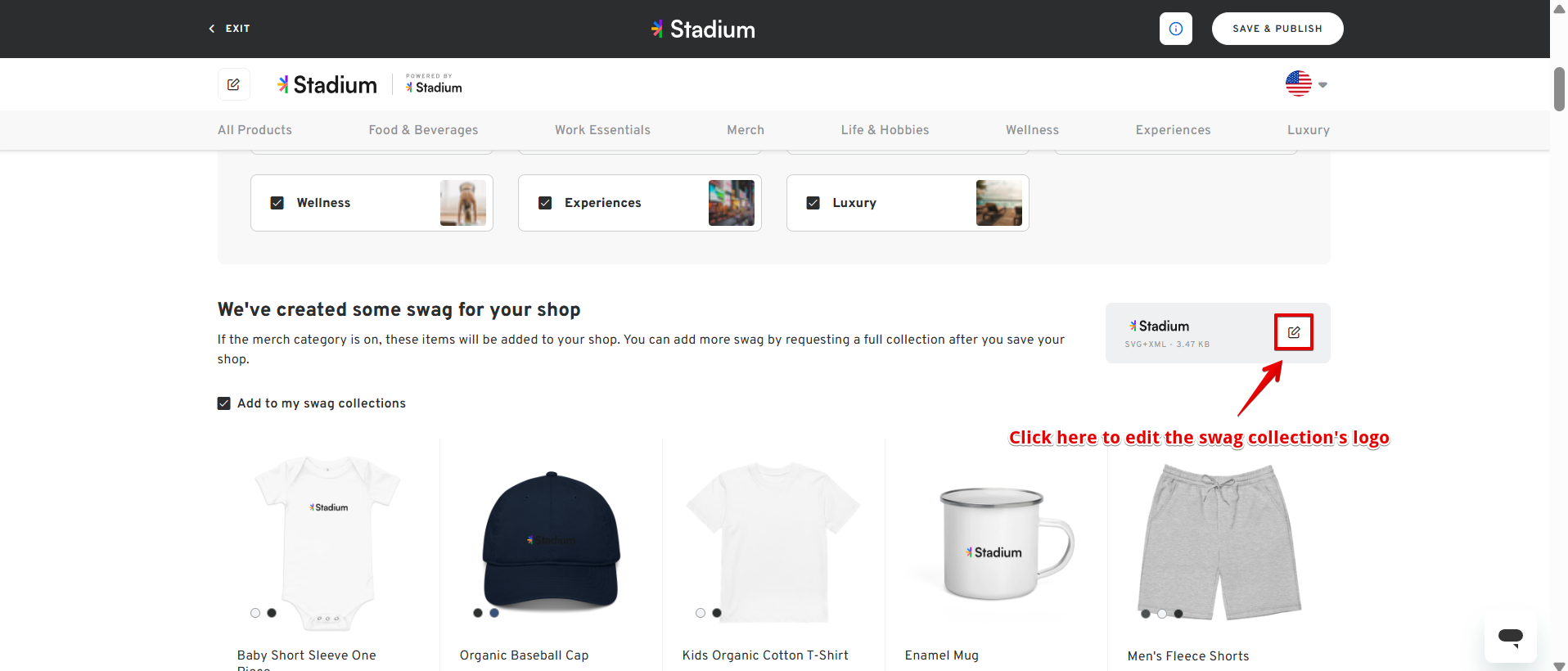 - Uploading a logo will generate automated swag collections for your shop.