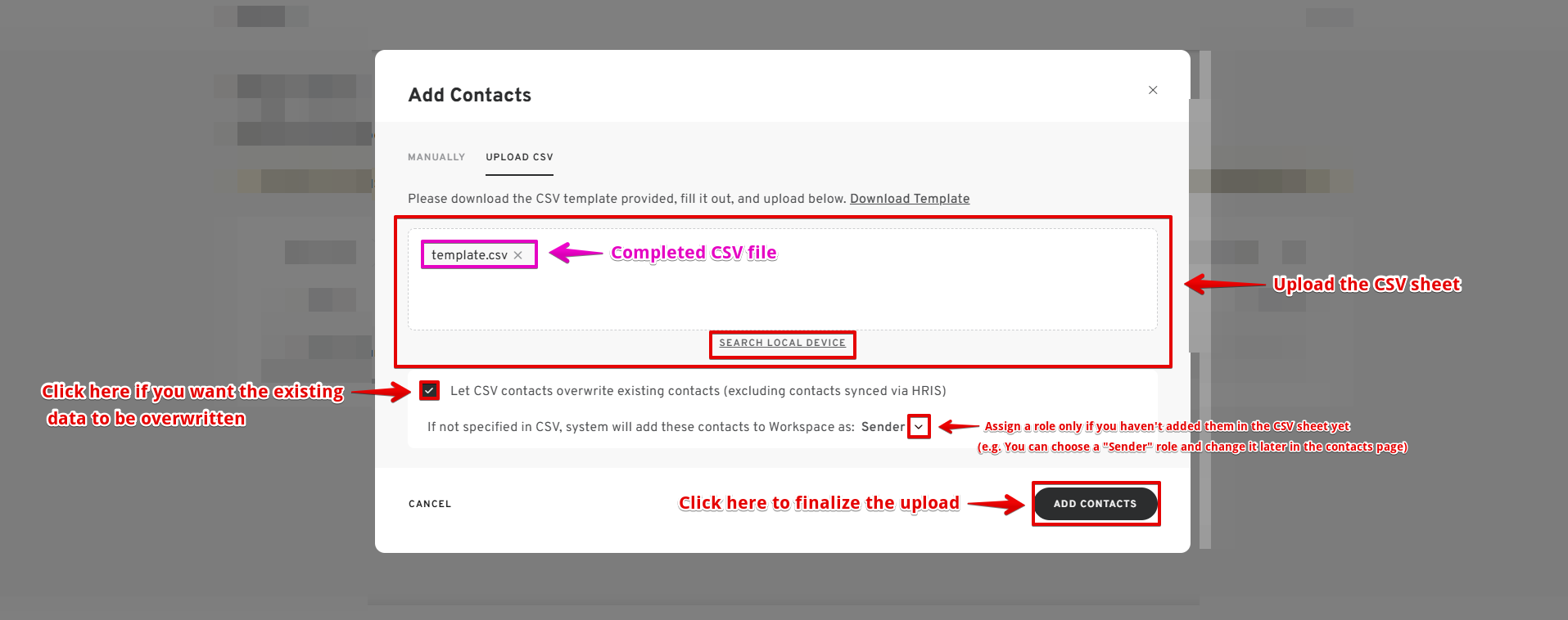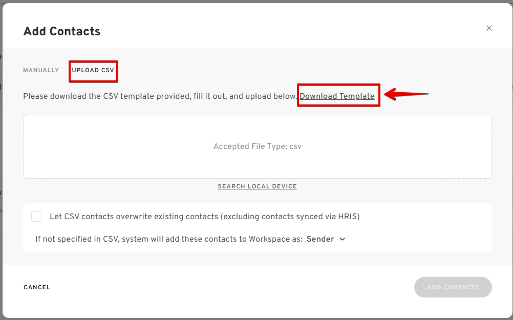 (Optional) Check the box for Let CSV contacts overwrite existing contacts (excluding contacts synced via HRIS) if you want updates to replace current records.