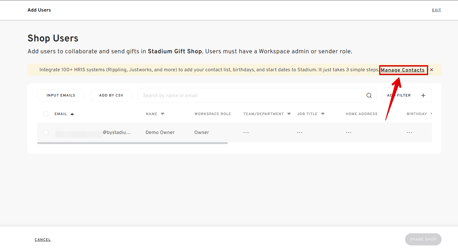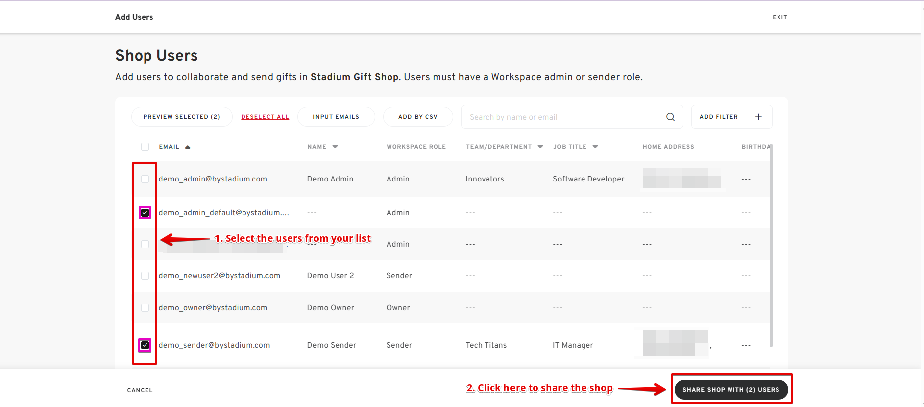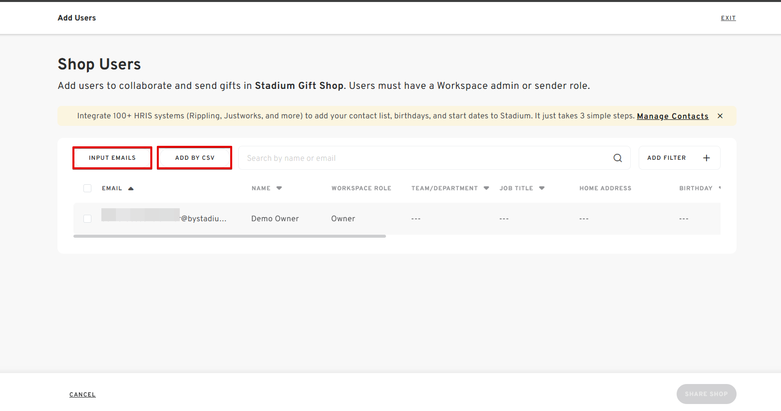 - If you already have existing contacts in your account or have successfully added the new users, select the CHECK BOX of the user and click "SHARE SHOP WITH USERS" to save the changes.