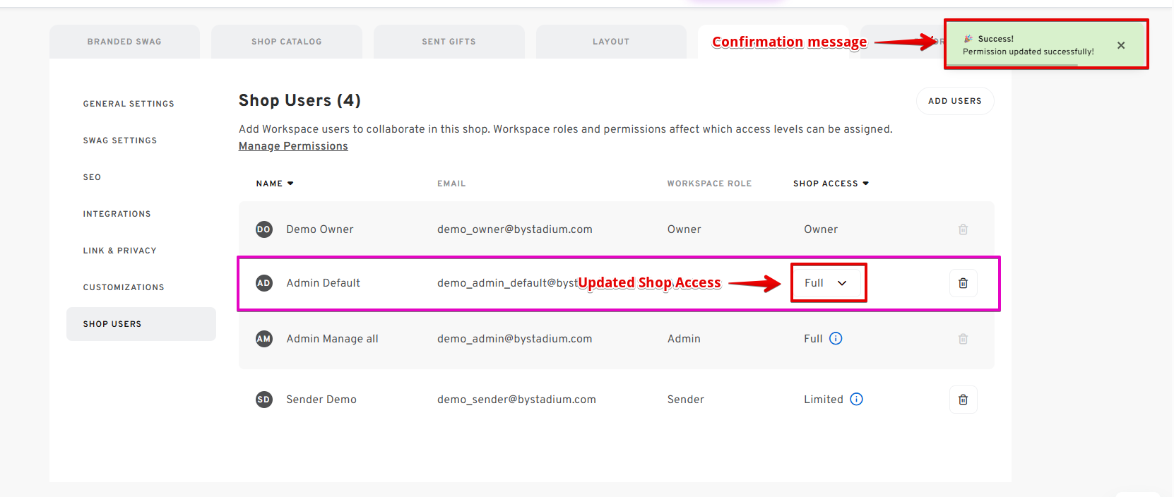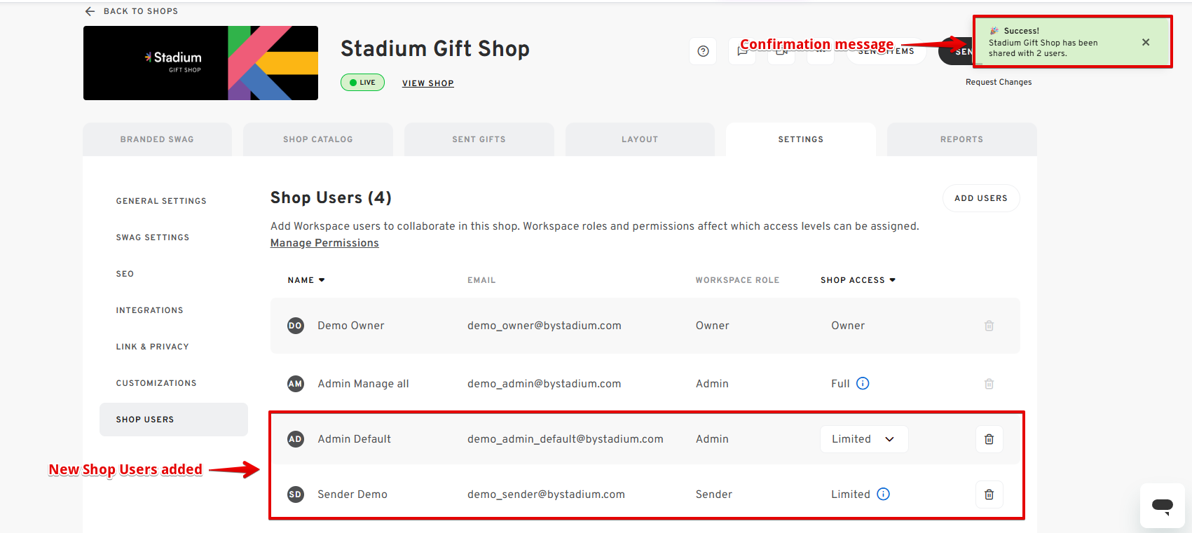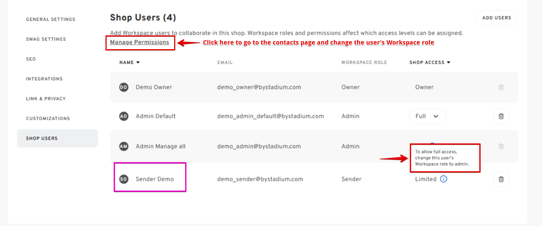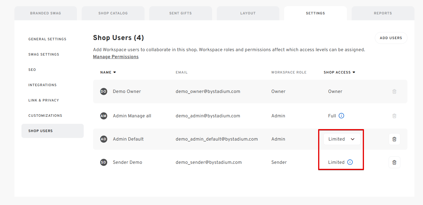- Users with a Sender Role in the Workspace can only have "Limited" Shop Access, even when added as a shop user.