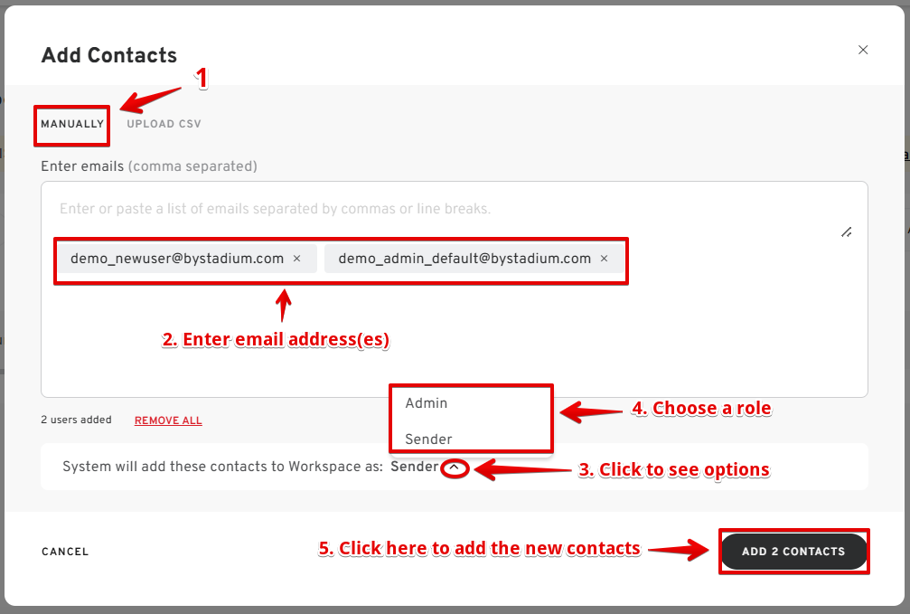 If you do not have existing contacts, you will be prompted to add admin details via email or a CSV sheet.