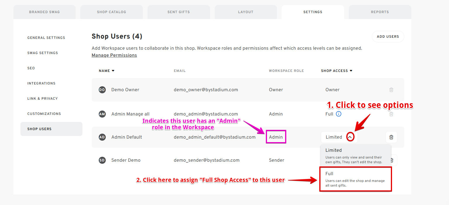 - Workspace Admins with default permissions are assigned Limited Shop Access by default, but Shop Owners can upgrade them to Full Access.