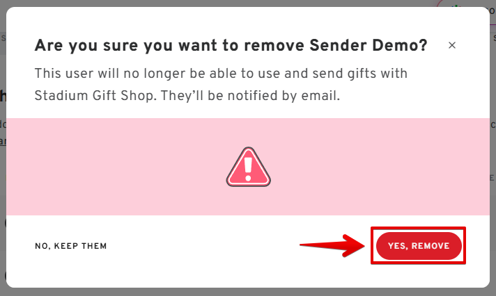 - To remove a user, click on the trash can icon next to their name, then on the pop-up window, confirm the removal by clicking YES REMOVE.