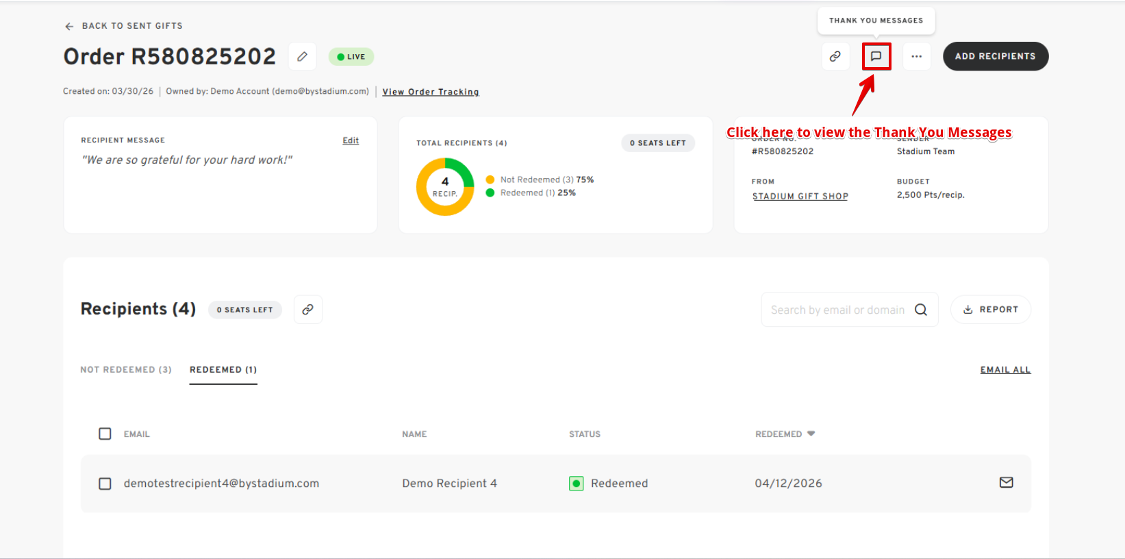 Keeping track of your recipients’ appreciation is easy when you download their Thank You Messages from your Stadium Shop orders. By accessing and saving these messages, you can maintain a record of feedback, track engagement, and showcase the impact of your gifting efforts. This step-by-step guide explains how to view, manage, and download thank you messages from your Stadium Shop orders, helping you streamline communication and keep a digital record of all recipient responses.