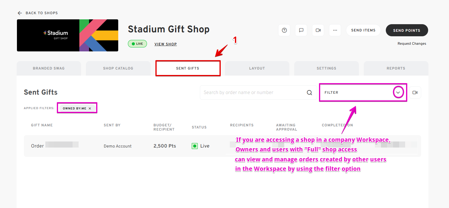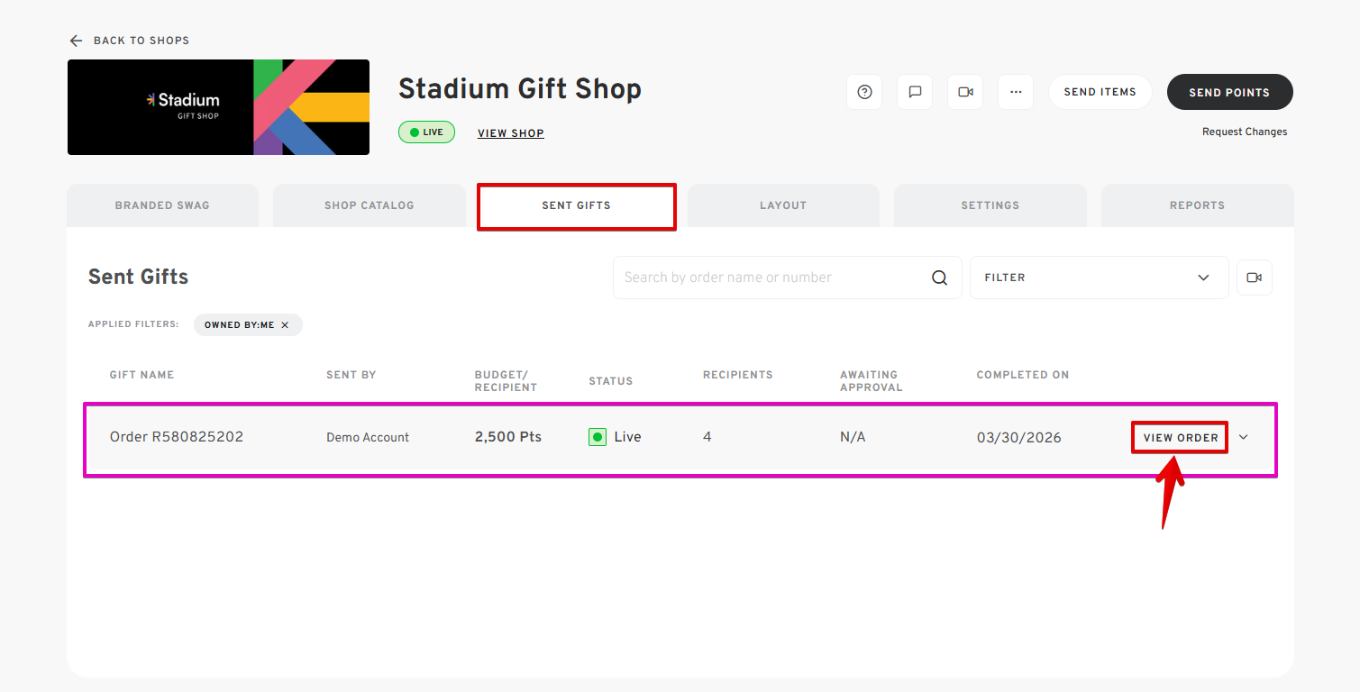 - From your shop's dashboard, navigate to SENT GIFTS.