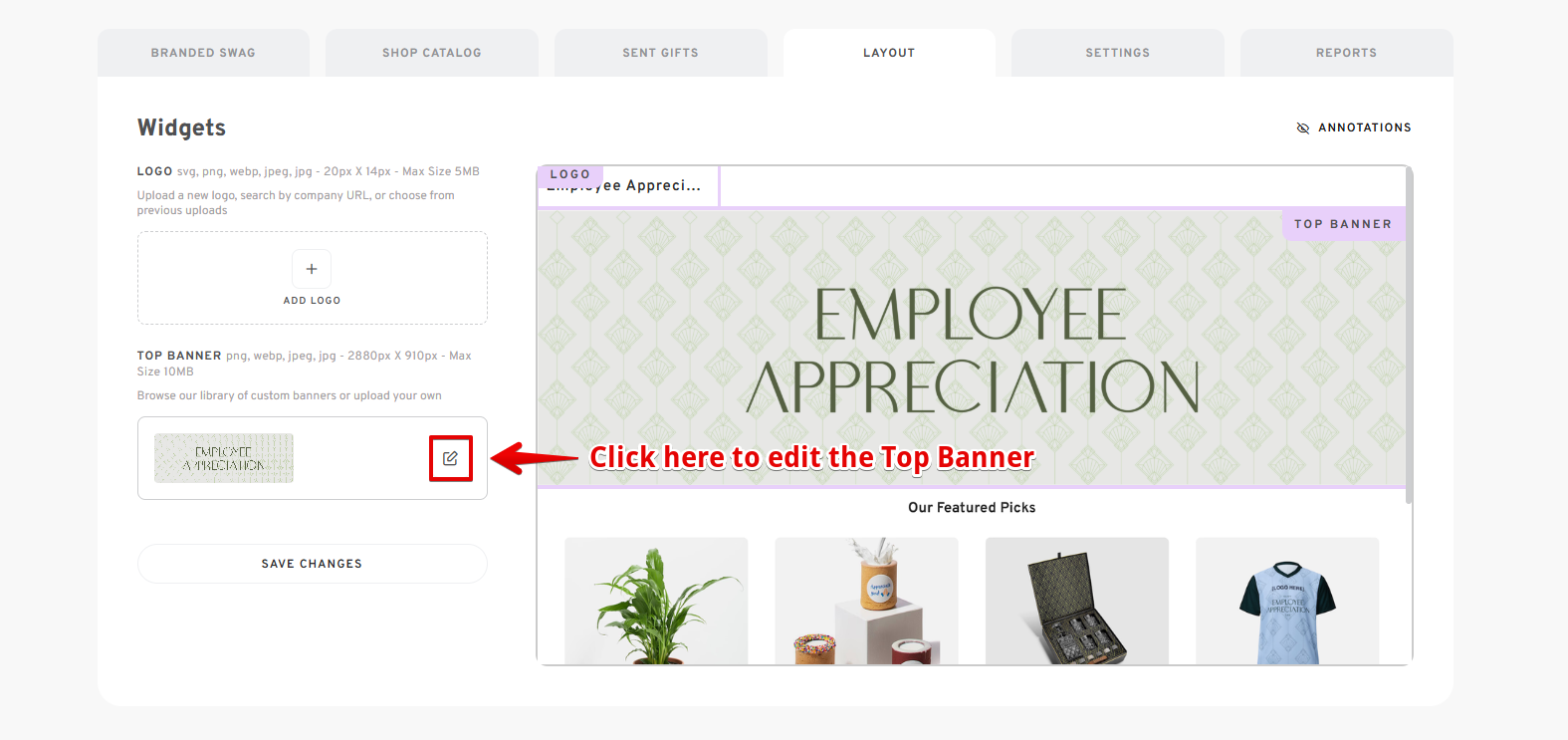 - To edit the Top Banner, click on the pencil icon located in the TOP BANNER section.