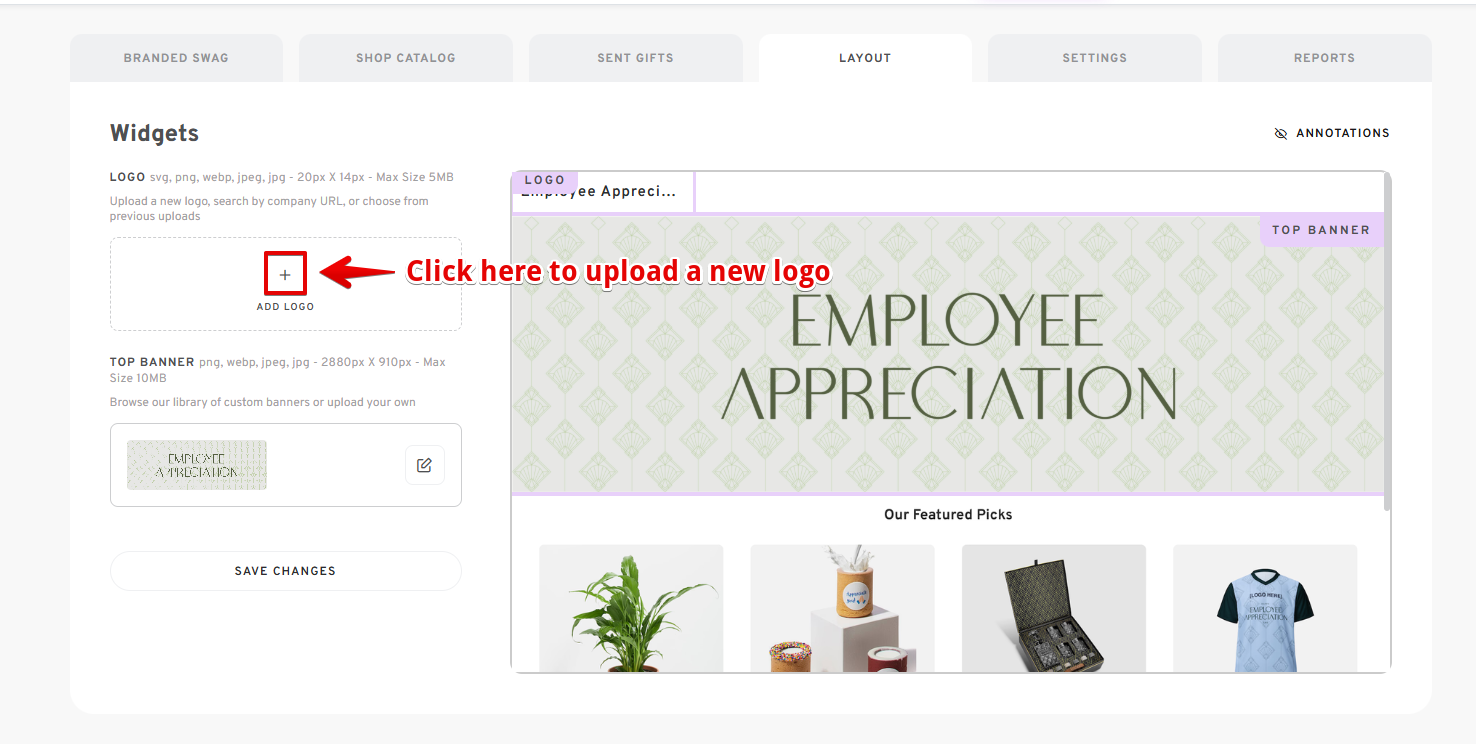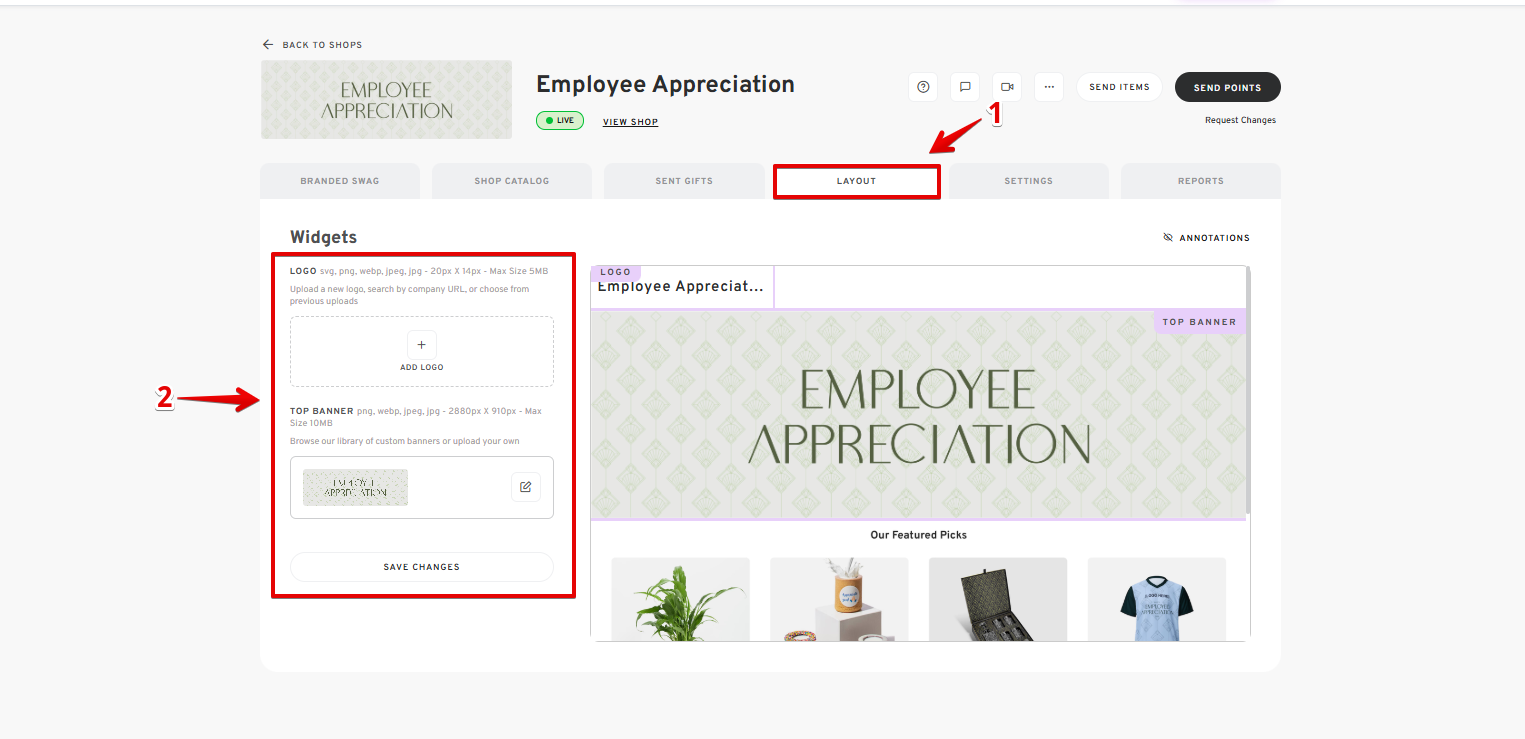 - Go to the "LAYOUT" section, where you can edit or upload the shop's logo and top banner.