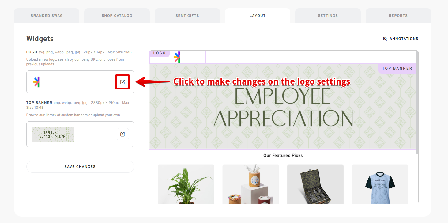 - To edit the shop's logo, click on the pencil icon located in the logo section under Widgets.