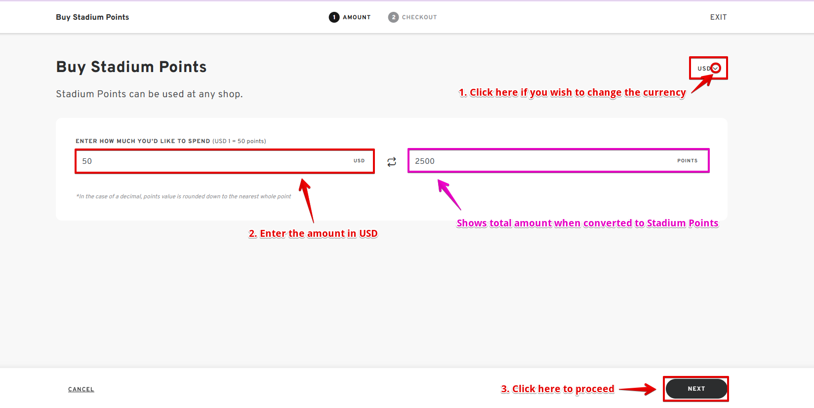 - Enter the amount you wish to spend to purchase Stadium Points. The system will display the equivalent Stadium Points based on the amount entered.