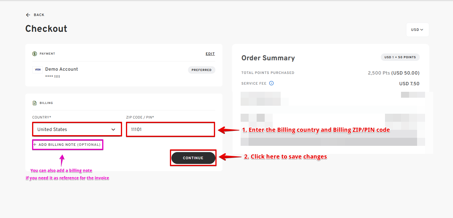 - Scroll down and enter the BILLING COUNTRY and BILLING ZIP CODE.