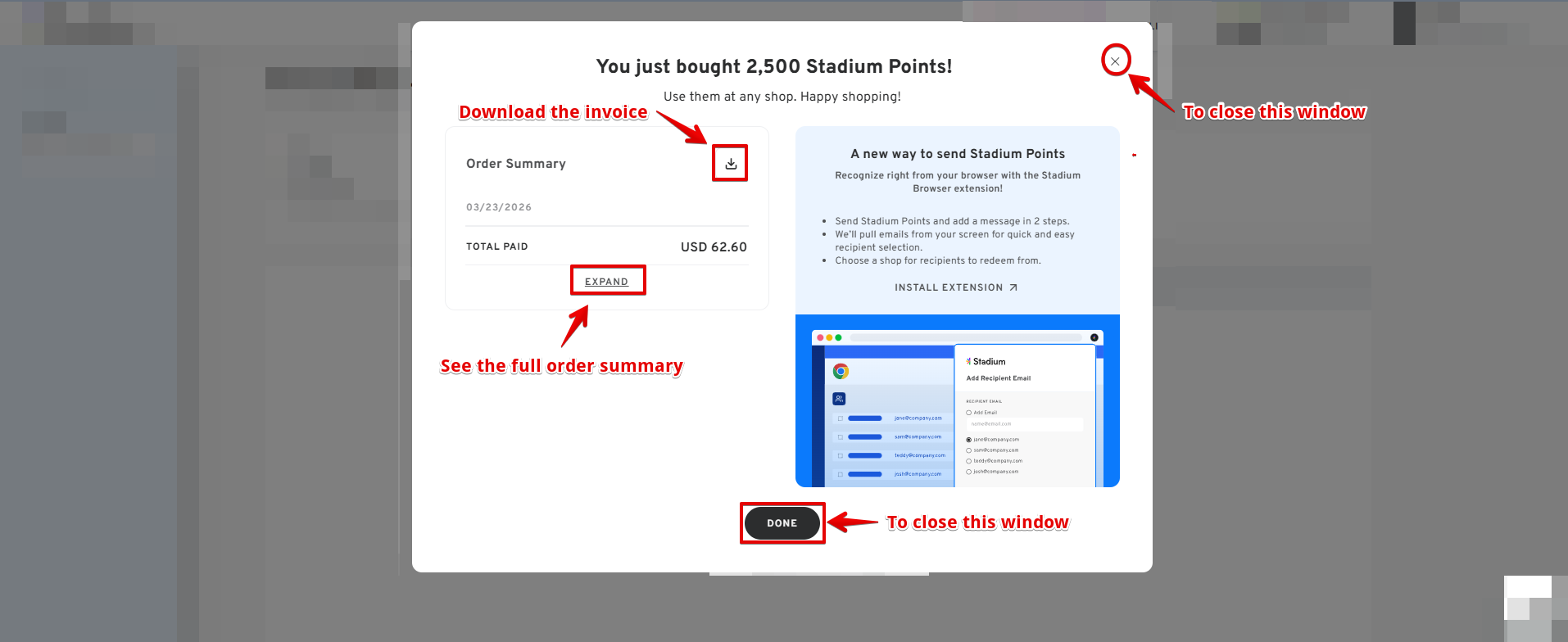 Congratulations! The purchased Stadium Points will automatically be added to your account.