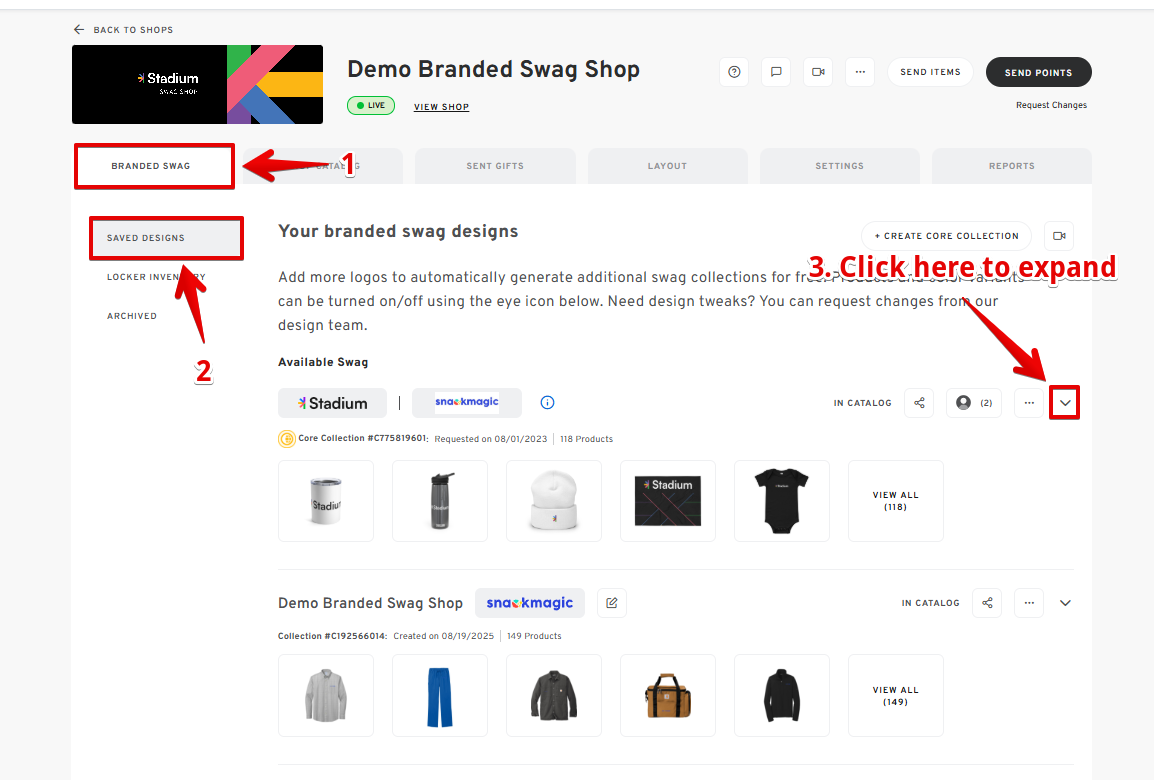 - Go to the BRANDED SWAG tab and go to SAVED DESIGNS.