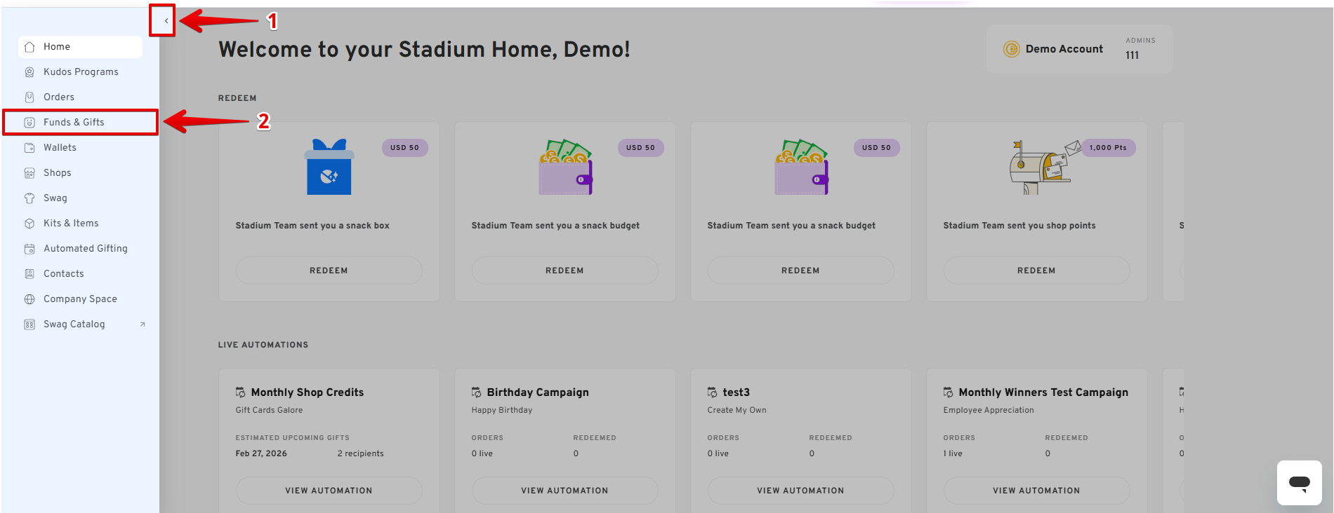 - You will be routed to the "Funds" dashboard, where you can find all your pending redemption gifts and available shops for placing an order.