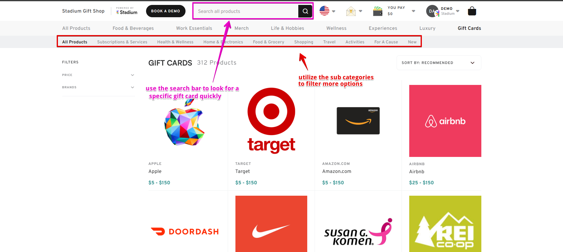 - Use the search bar to look for a specific gift card quickly.