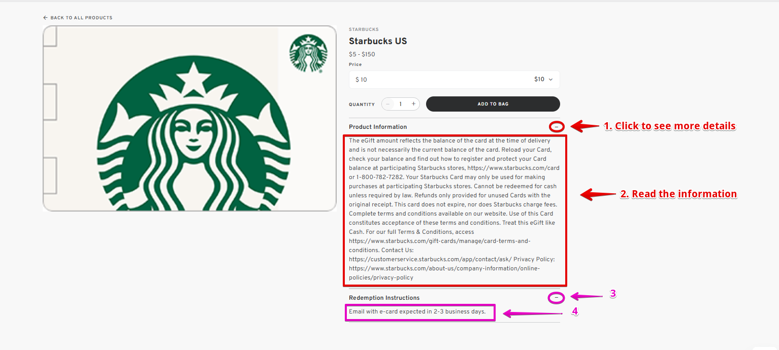 - Click the "+" button to see the complete product information and redemption instructions.