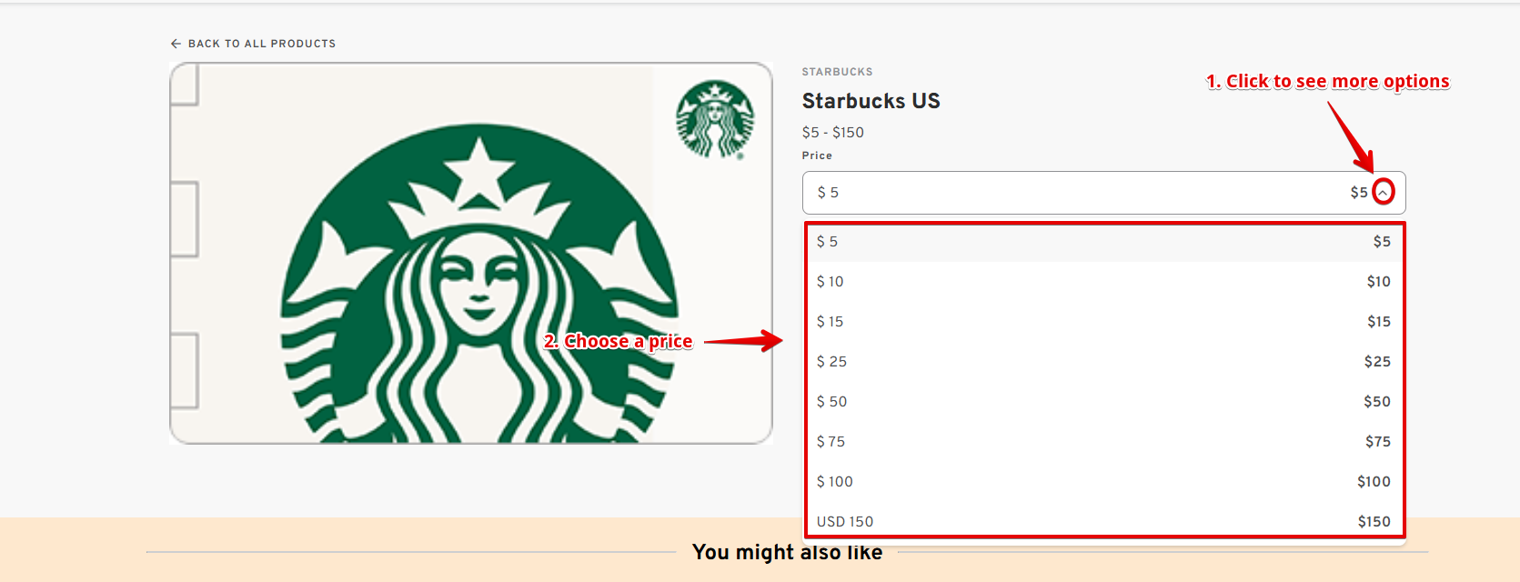 - Click on the drop-down arrow to choose the price of the gift card options are available.
