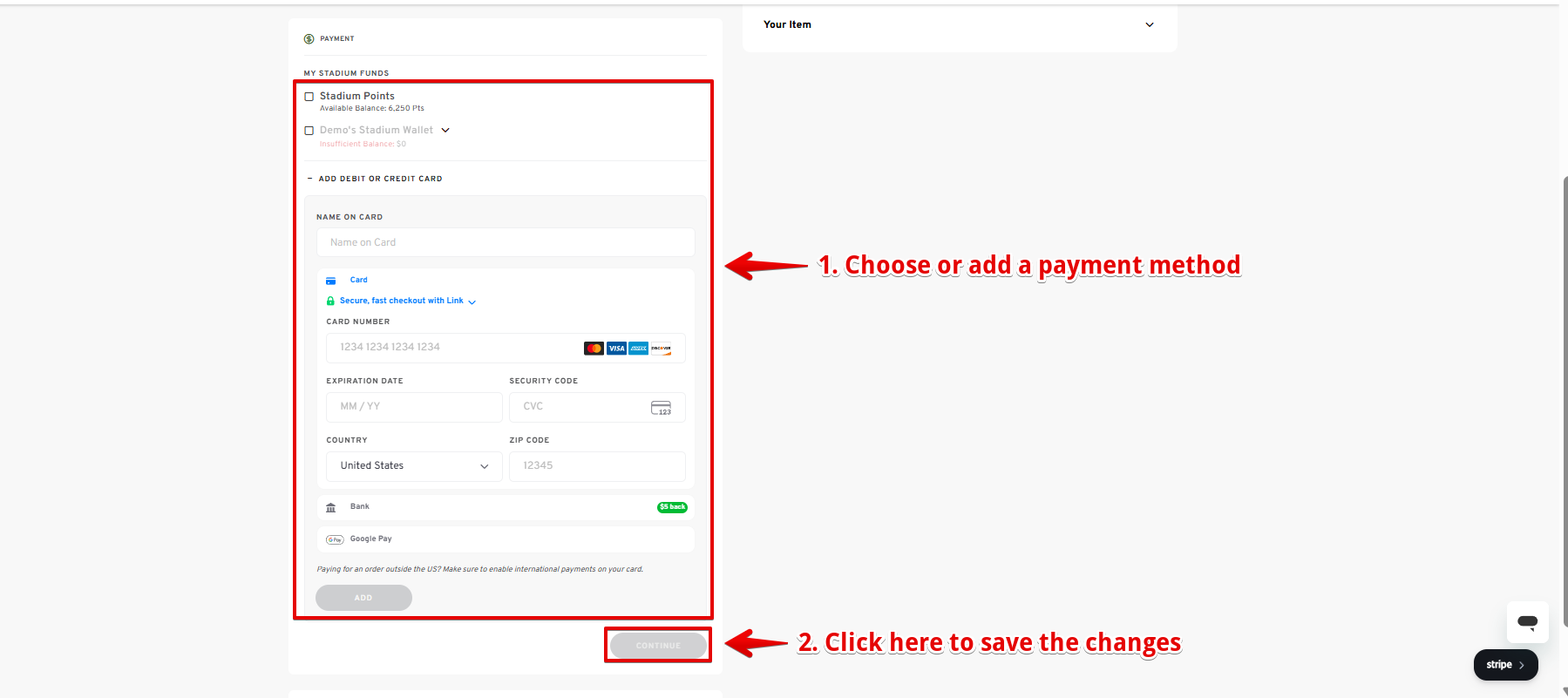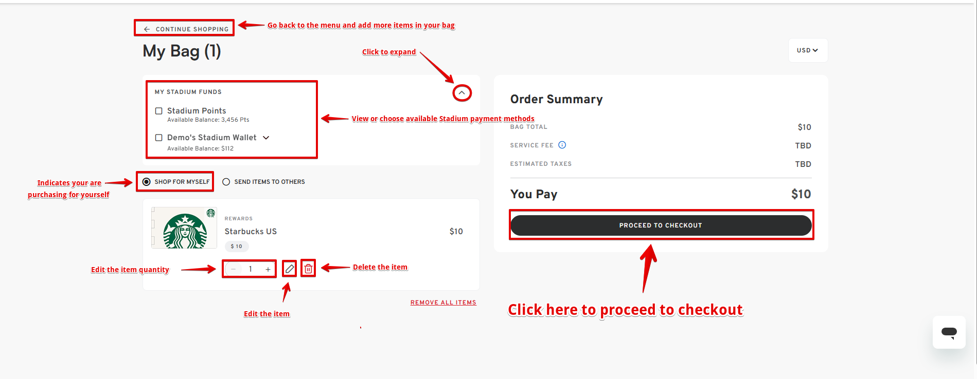 - On the "My Bag" page, you can check all the details about your order, including setting a payment method from your available Stadium funds, adding more items, reviewing the payment breakdown, or going back to shopping. If you are satisfied with your cart, proceed to the checkout page.