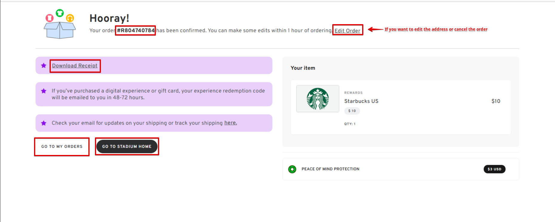 - Once the order is successfully placed, you will see a confirmation page with your order number, the ability to edit the address or cancel the order (within 1 hr timeline), download your receipt, go to your orders page, or go back to the home page.