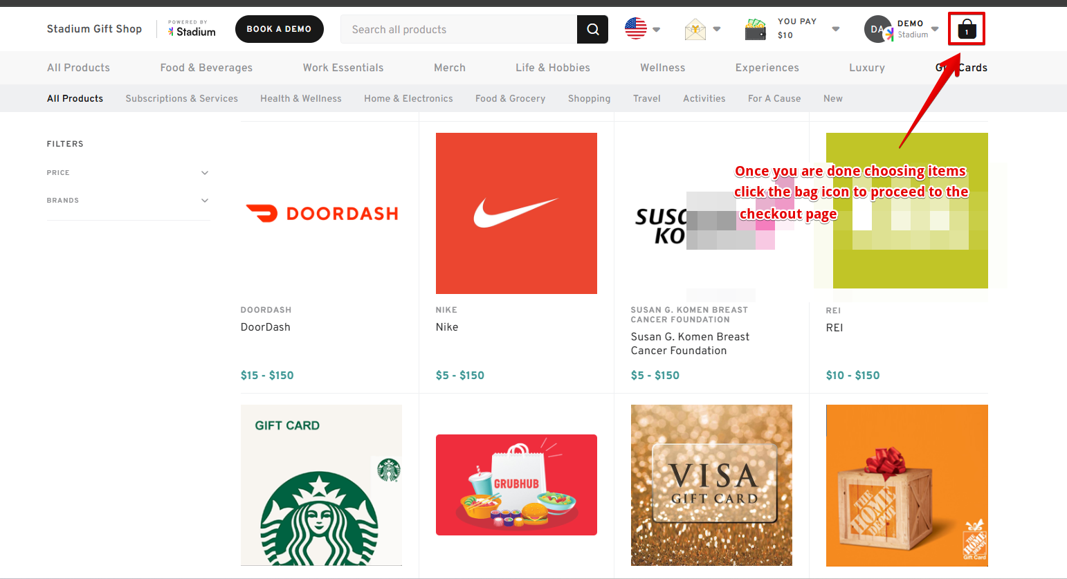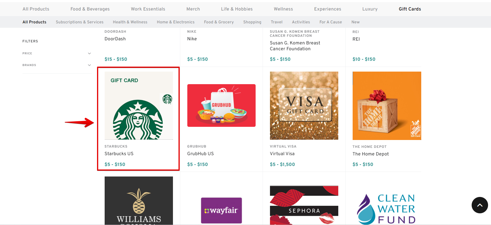 Filter and Choose a Gift Card