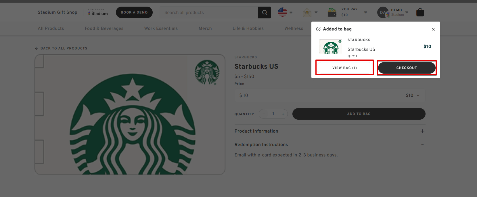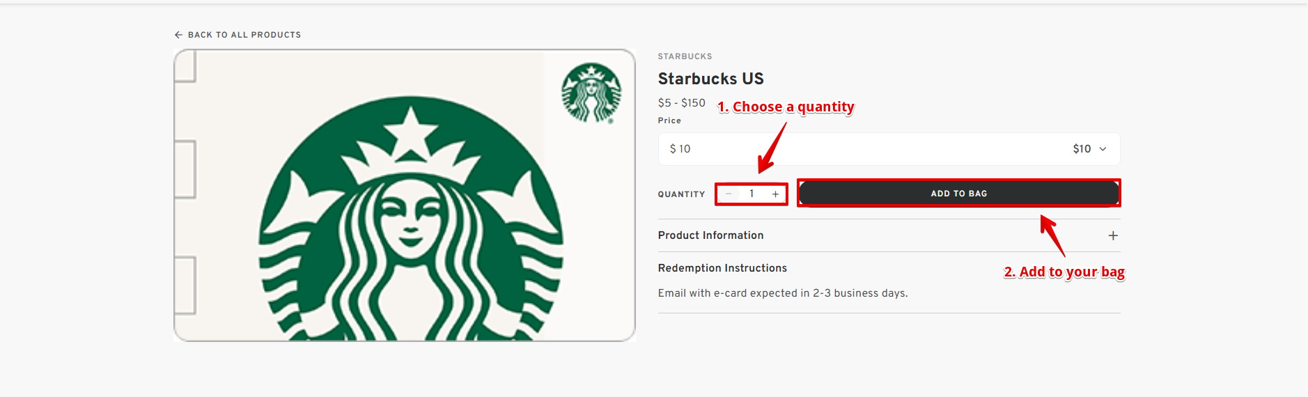 - Set the quantity of the gift card you wish to purchase and click "ADD TO BAG".