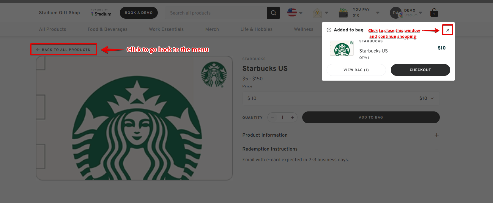 - If you want to add more items, you can close the small pop-up and click BACK TO ALL PRODUCTS to go back to the menu.