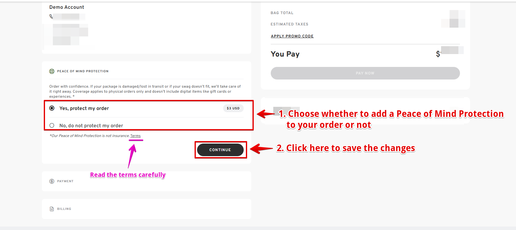 - Scroll down and choose whether you want to add Peace of Mind Protection to your order or not.