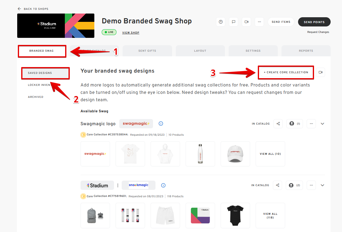 - Under the "BRANDED SWAG" tab, go to SAVED DESIGNS