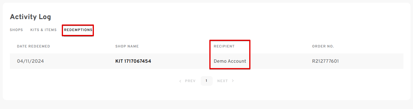 - The activity log will display the total number of swag items redeemed from the selected shop.