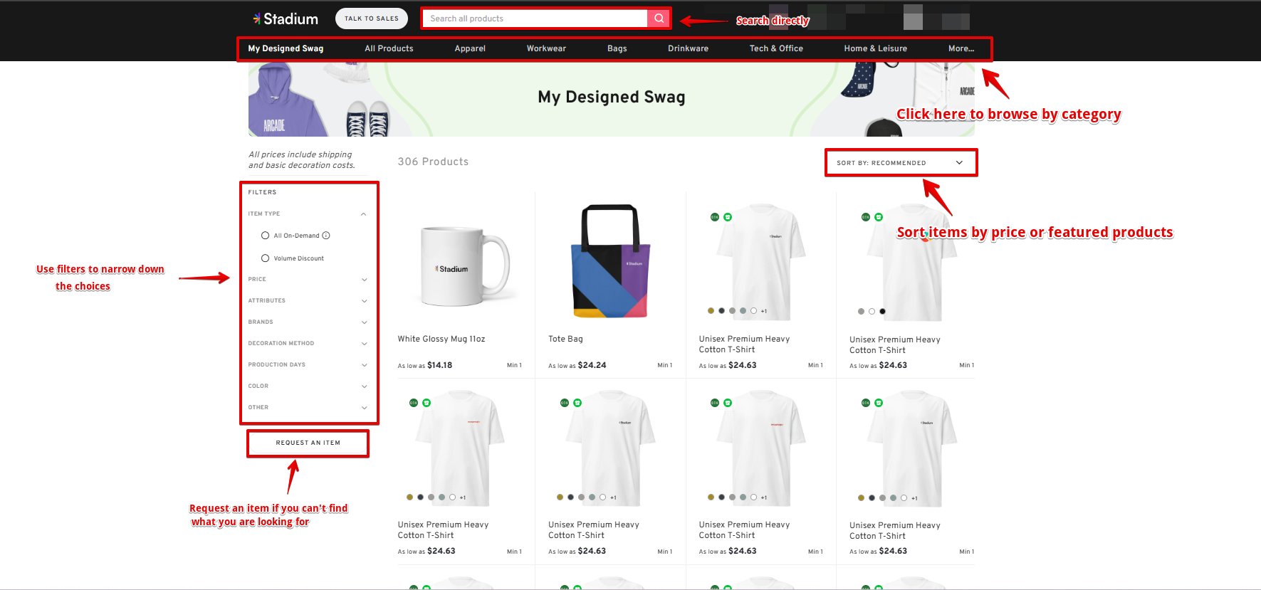 - Use filters or sort items by price or featured list. You can also request an item if you can't find what you are looking for.
