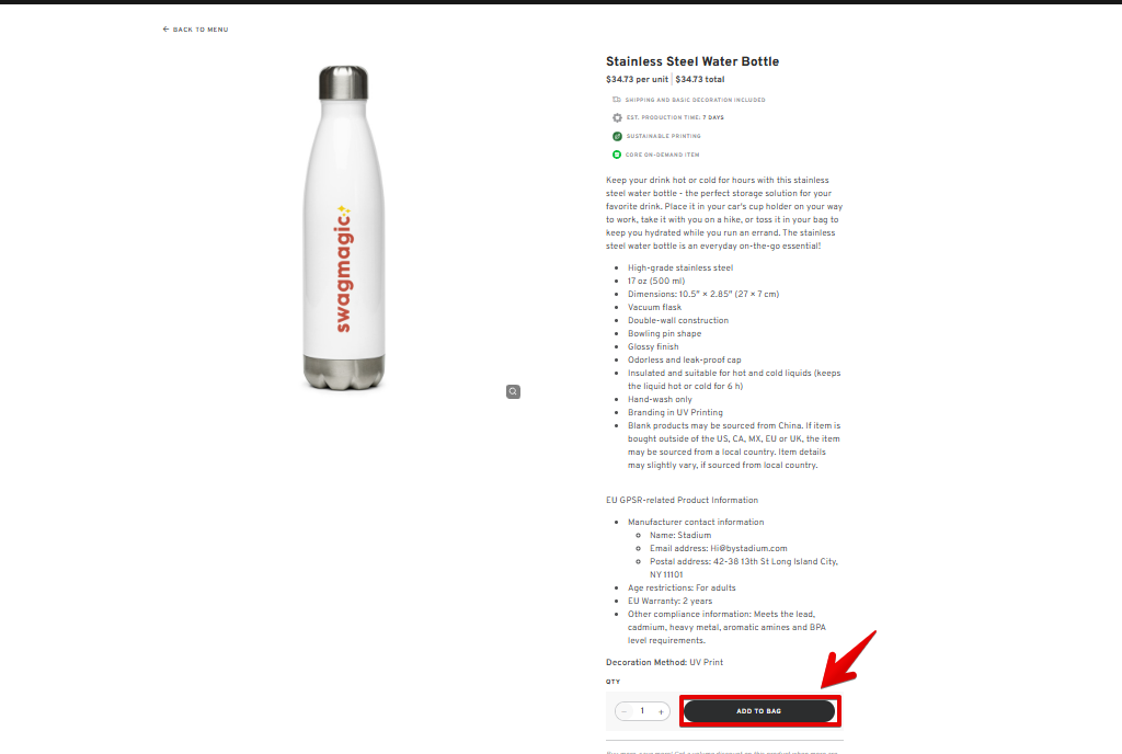 - If you plan to use the swag items for your swag kit or store them at our warehouse for distribution, choose "Stadium Warehouse" as the address.