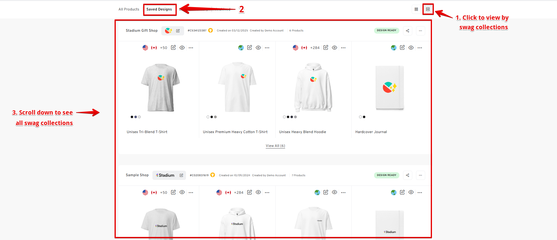 - On the SAVED DESIGNS page, you will see all the swag collections in your account, including the mock-ups for a shop swag collection, bulk order, or even items added to your inventory.