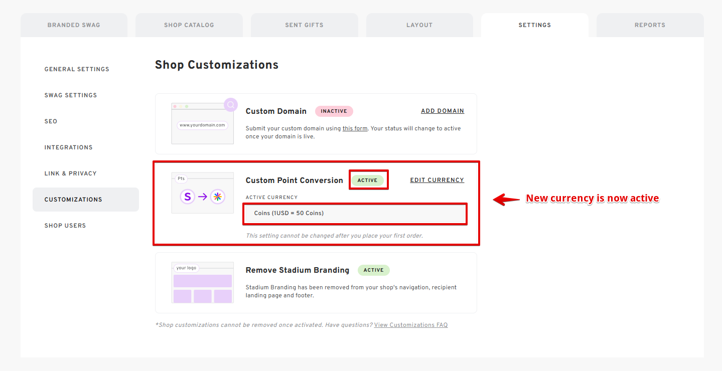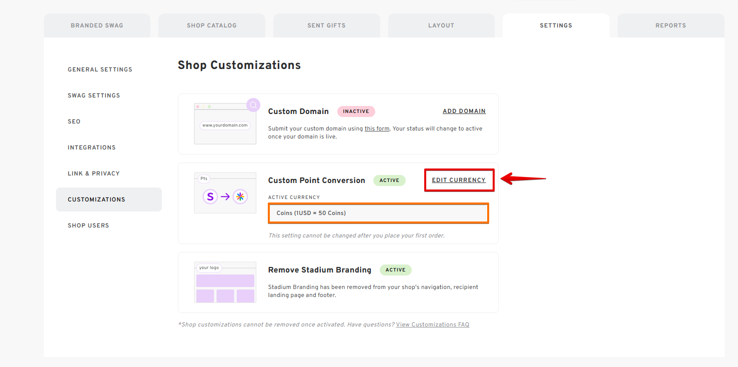 - On the CUSTOMIZATIONS section, click on EDIT CURRENCY under Custom Point Conversion.