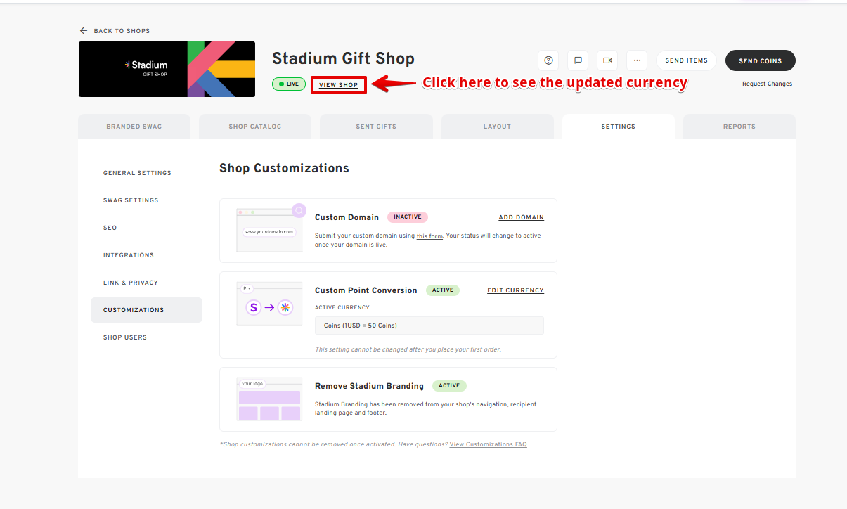 Congratulations! You've successfully configured Custom Point Conversion for your Stadium Shop, offering a personalized and branded shopping experience for your users.