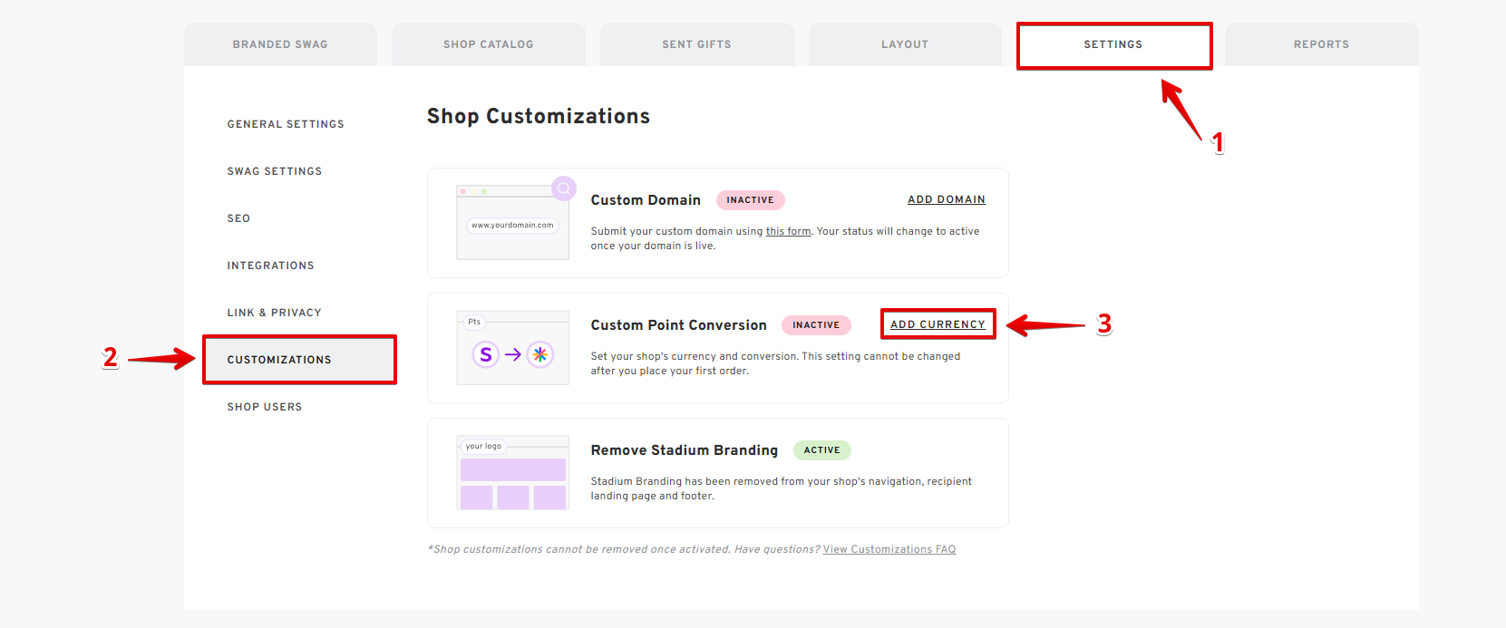 - Navigate to your shop's settings and select the "Customizations" tab to begin.
