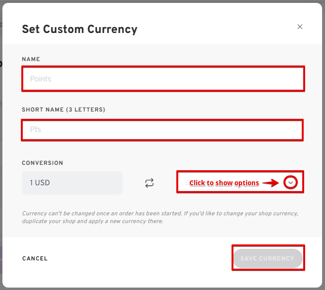 - A pop-up window will appear where you can specify the name of your custom currency, a three-letter abbreviation, and the conversion rate per dollar. Enter these details and click "SAVE CURRENCY" to confirm.