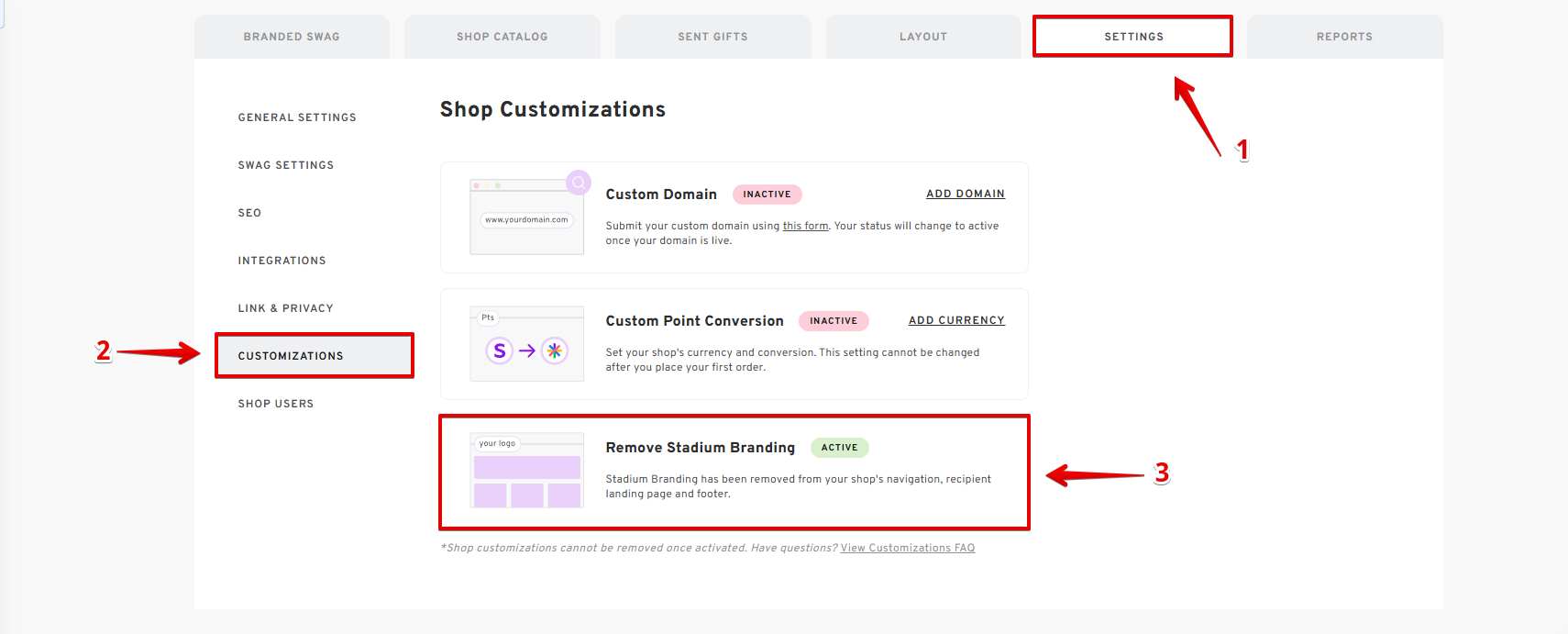 - Locate the "Remove Stadium Branding" - this will be active by default once your account has been tagged as a Enterprise account.