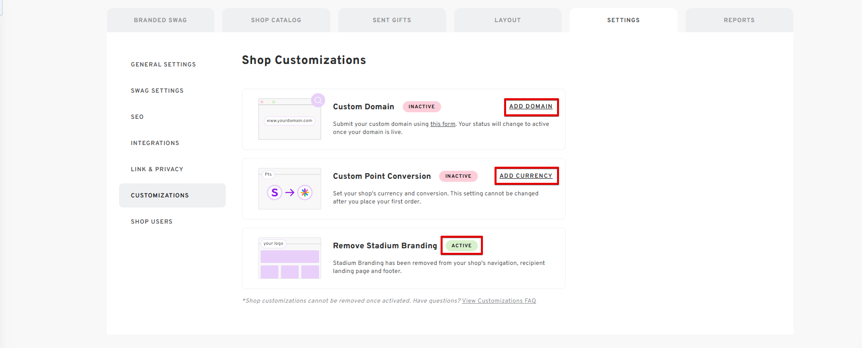 Looking to remove Stadium branding and unlock advanced shop customization features in your Stadium account? With Stadium's customization features, you can fully personalize your Stadium Shop by removing default branding, adding a custom domain, setting up a custom currency, and tailoring your shop’s look to reflect your company identity.