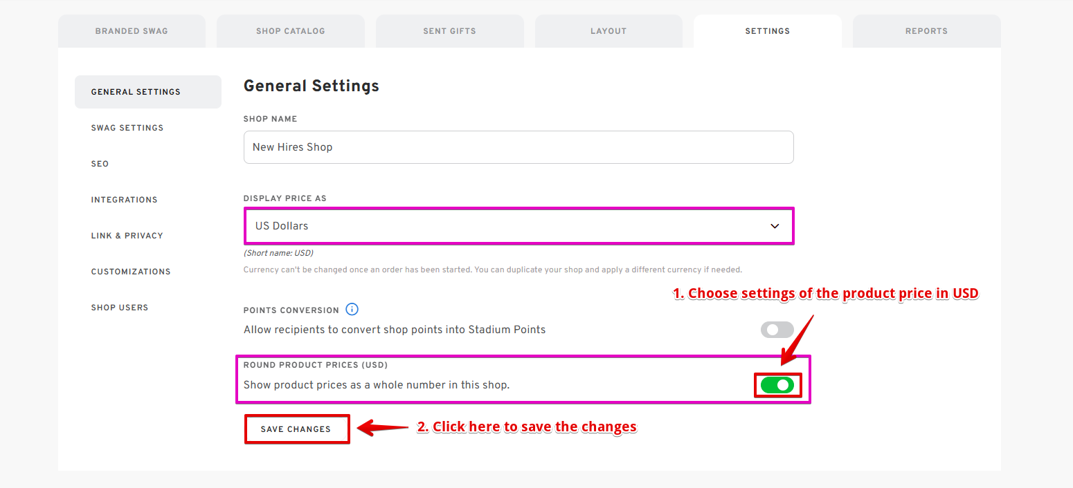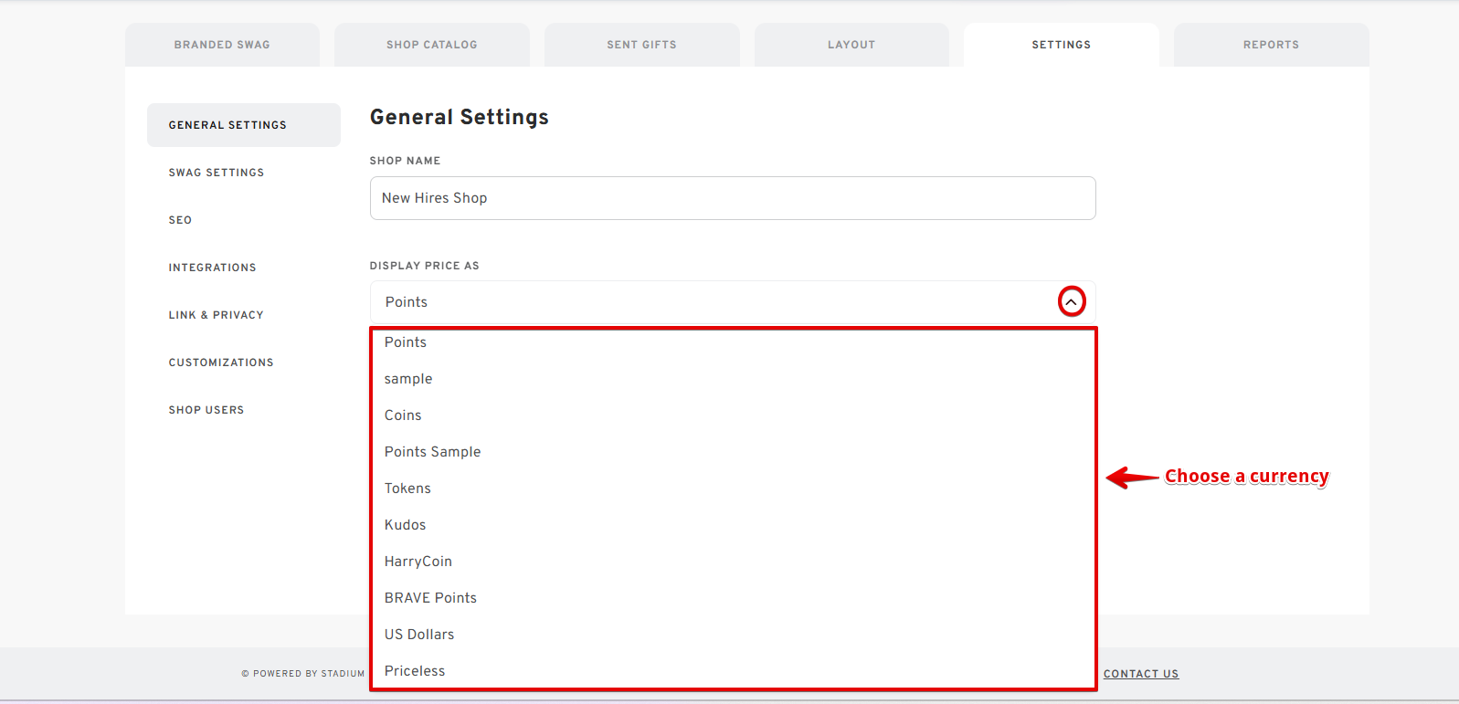For customized currencies other than USD and Stadium Points, follow the steps in this article